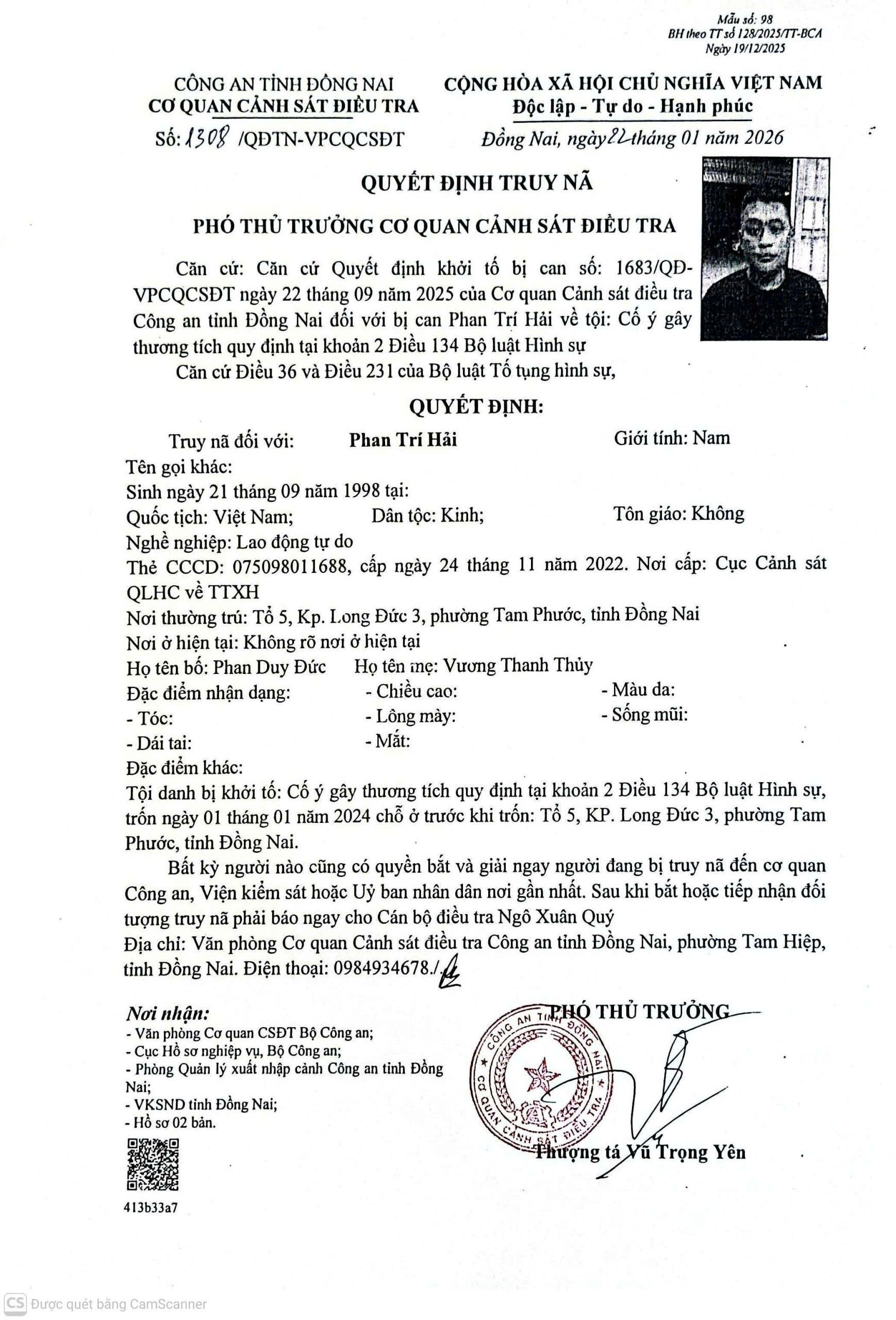 Theo hồ sơ vụ án, ngày 22/9/2025, Hải đã bị Cơ quan Cảnh sát điều tra Công an tỉnh Đồng Nai ra quyết định khởi tố bị can về tội “Cố ý gây thương tích” quy định tại Khoản 2 Điều 134 Bộ luật Hình sự. Tuy nhiên, đối tượng đã bỏ trốn khỏi nơi cư trú từ ngày 01/01/2024. Ngày 22/01/2026, Thượng tá Vũ Trọng Yên – Phó Thủ trưởng Cơ quan CSĐT Công an tỉnh đã ký Quyết định truy nã số 1308/QĐTN-VPCQSĐT đối với Phan Trí Hải.