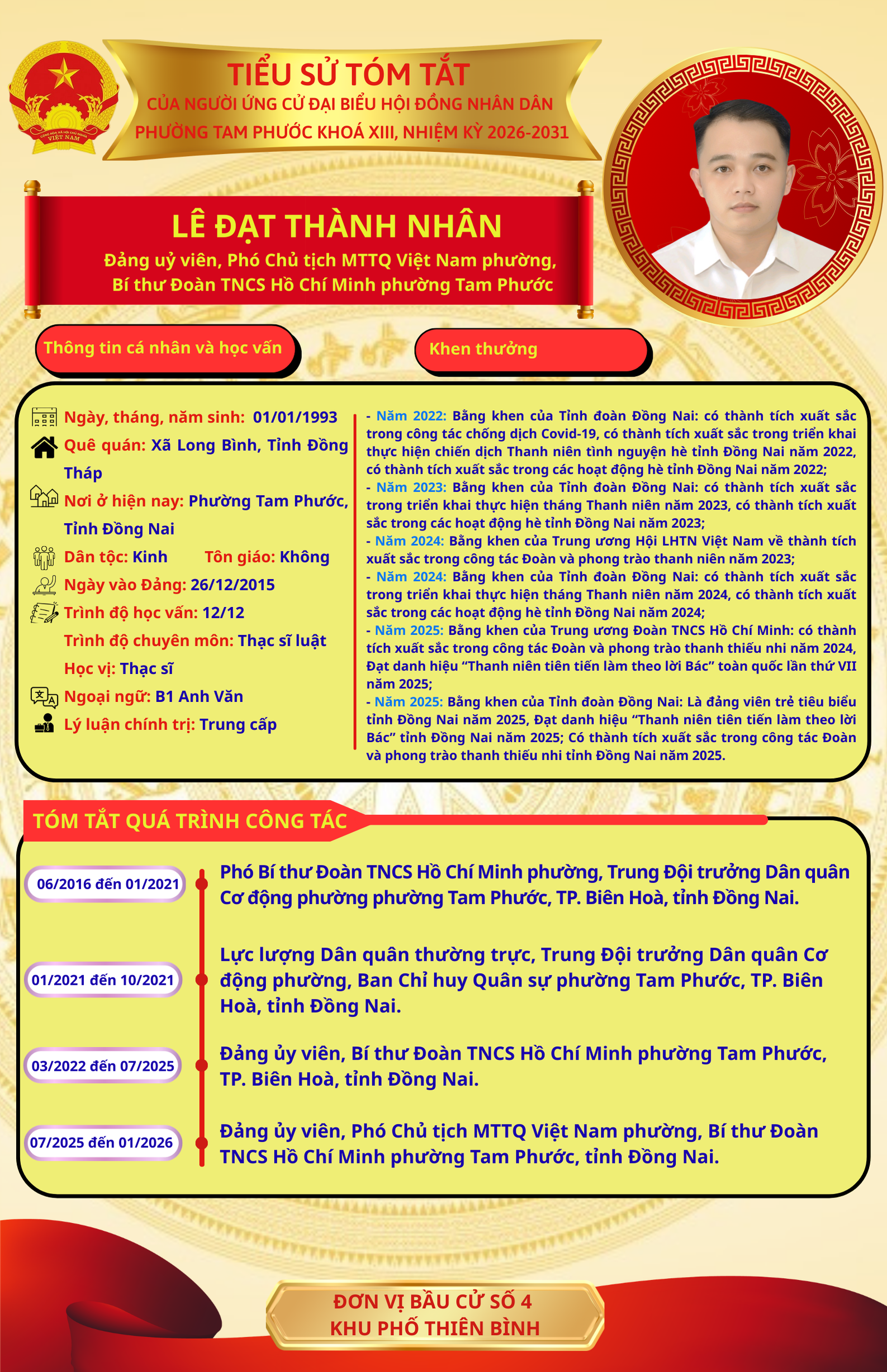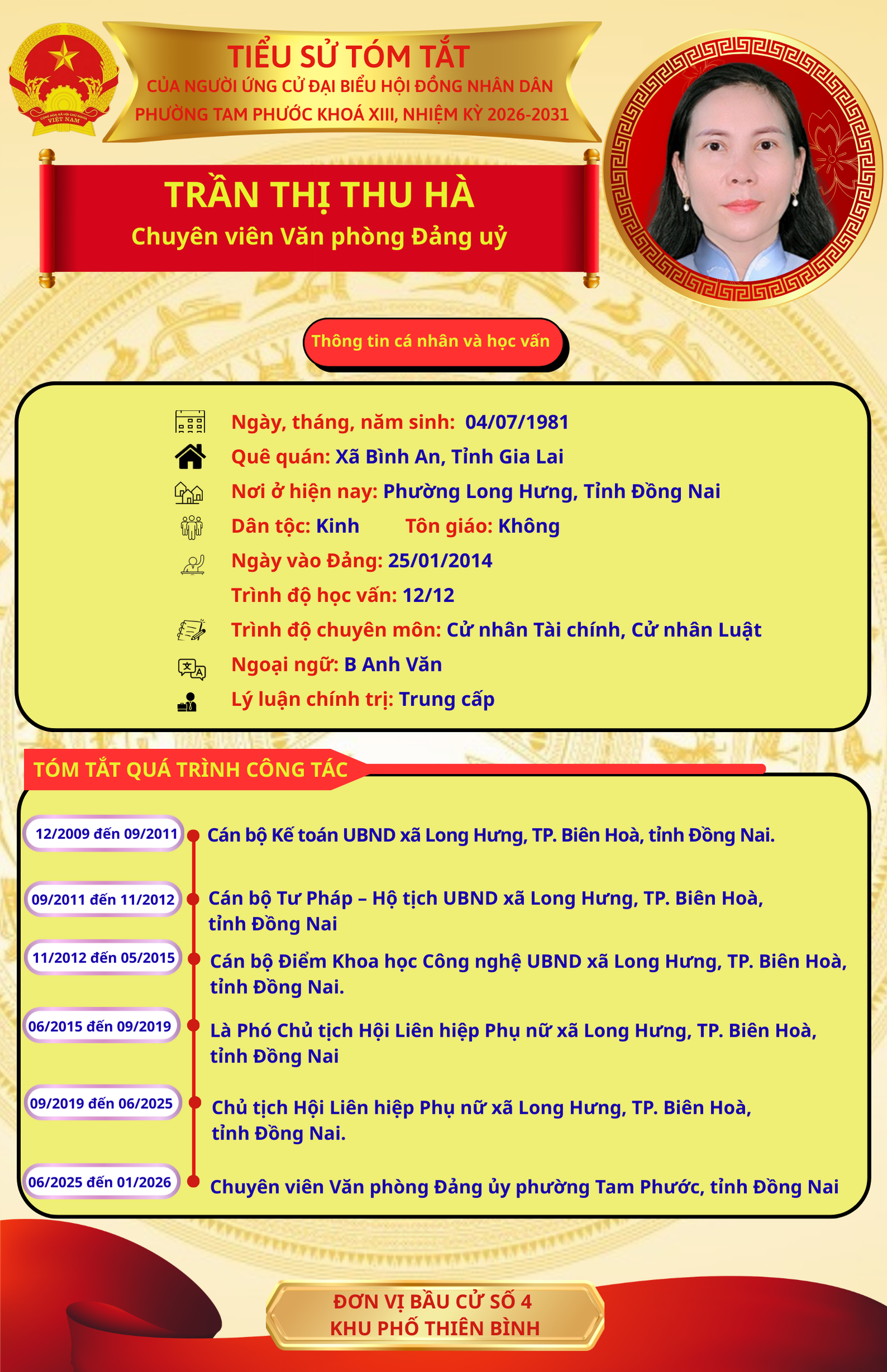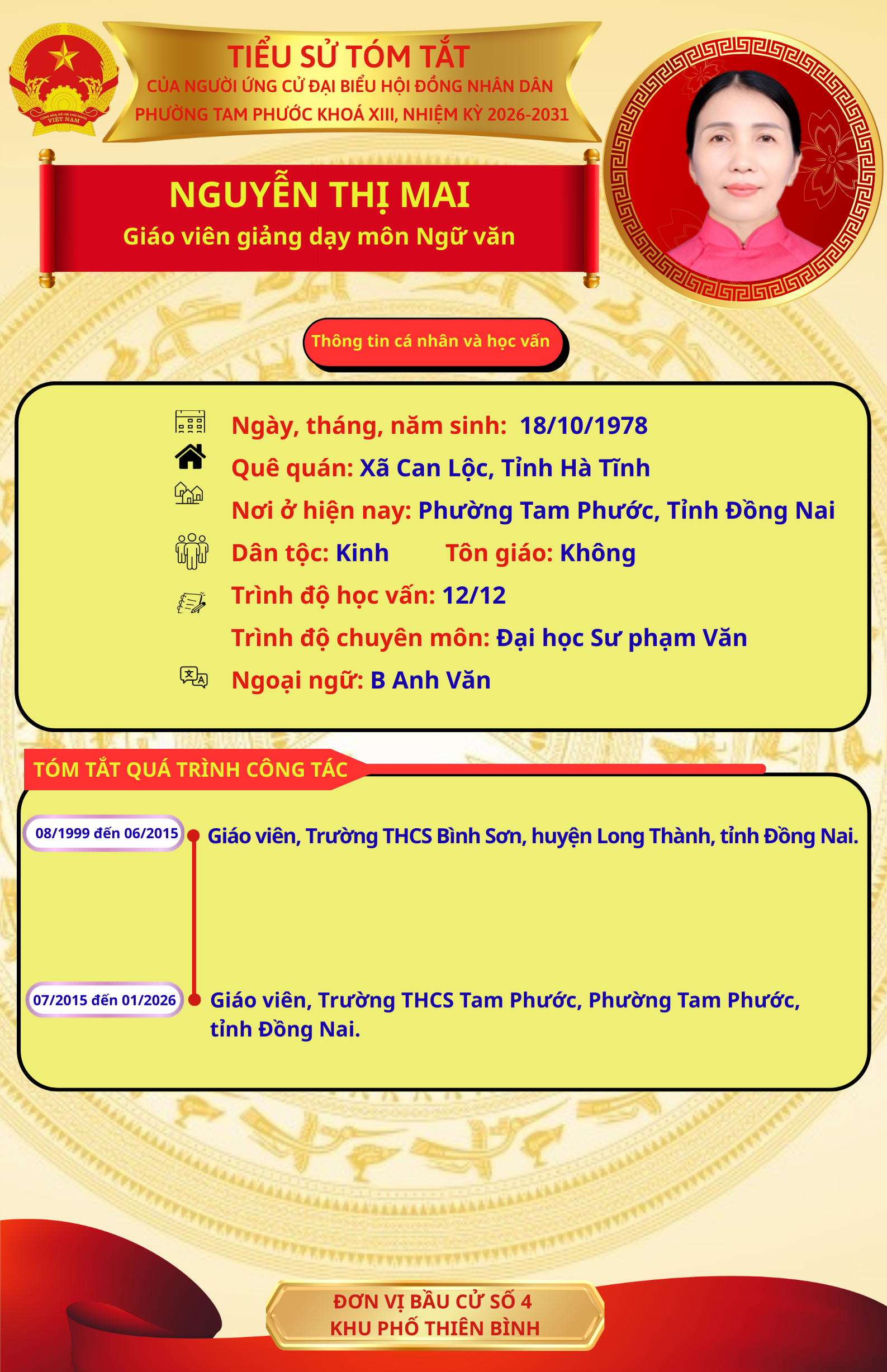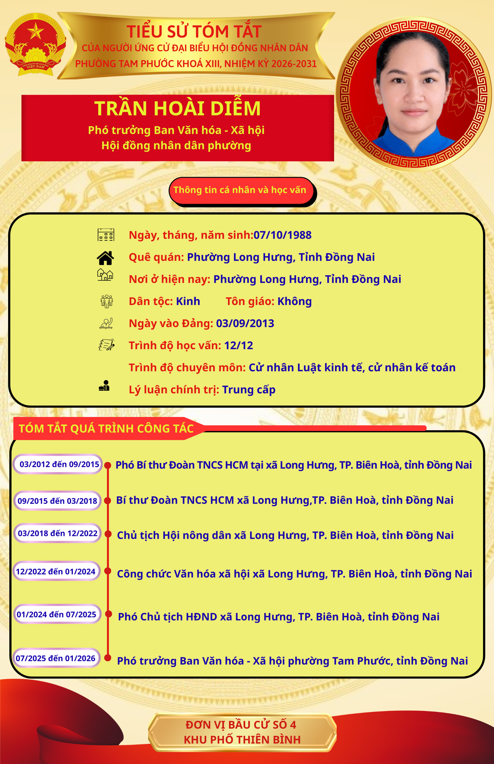 Để chuẩn bị cho ngày bầu cử 15/03/2026, Ủy ban Bầu cử phường Tam Phước trân trọng giới thiệu đến cử tri danh sách và tiểu sử tóm tắt của những người ứng cử đại biểu Hội đồng nhân dân phường Tam Phước (khóa XIII), nhiệm kỳ 2026-2031.