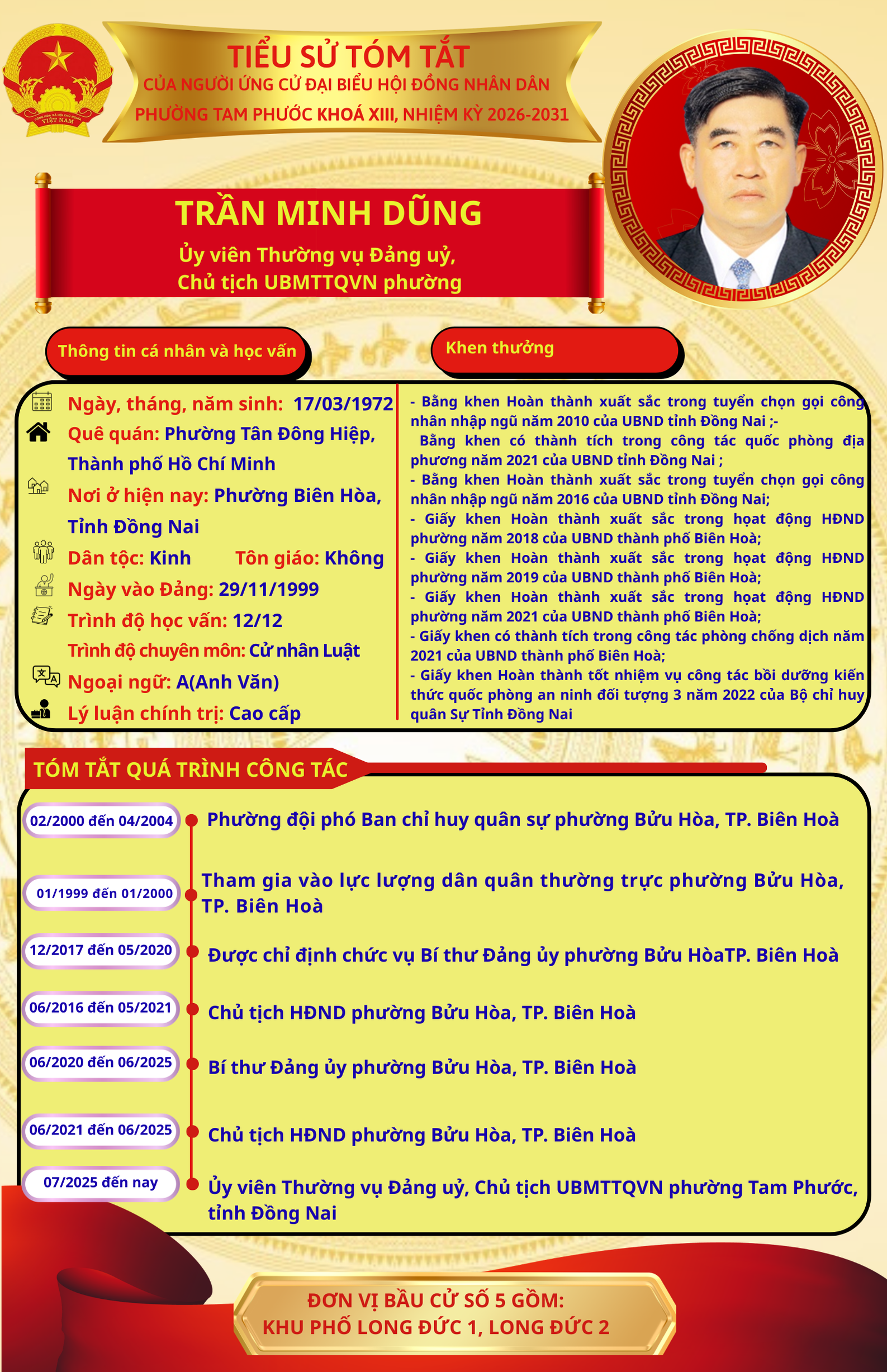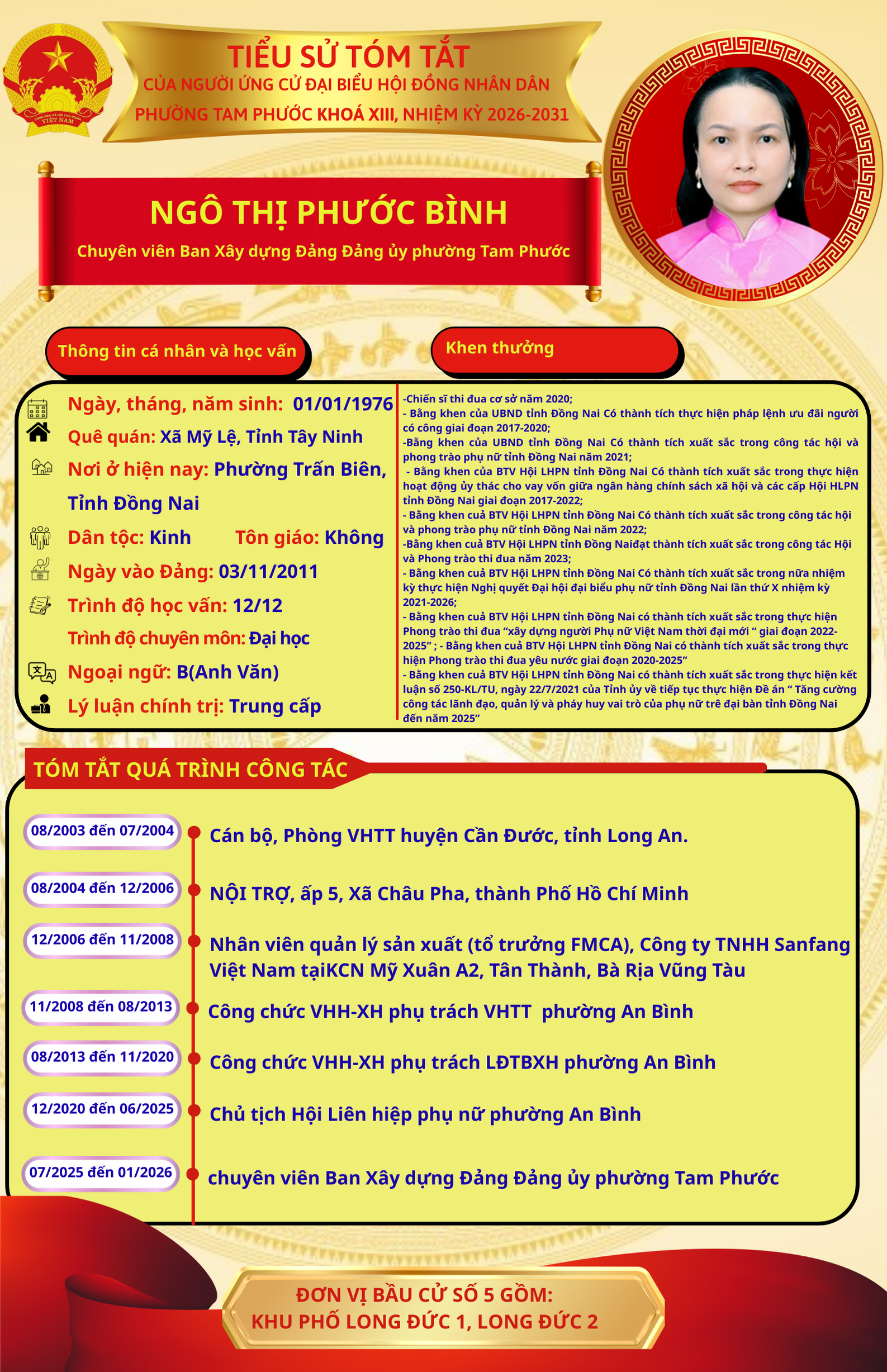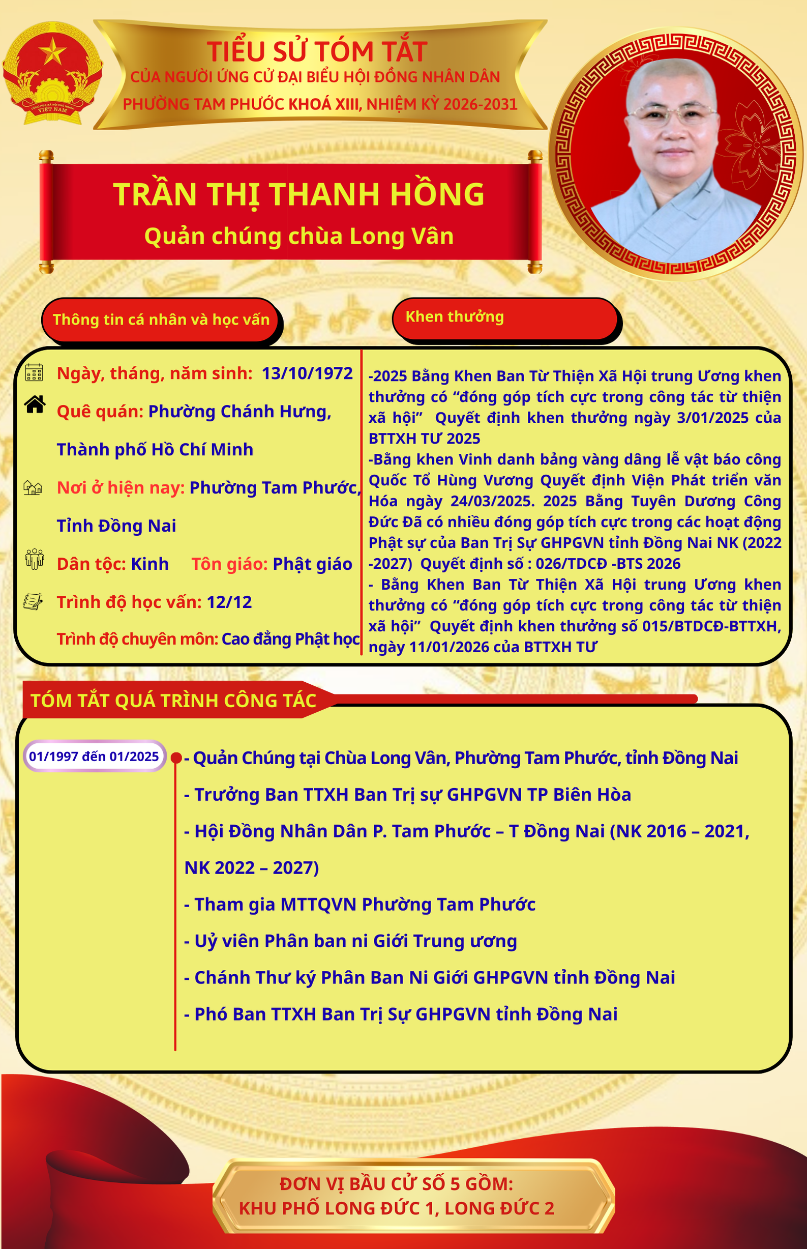 Để chuẩn bị cho ngày bầu cử 15/03/2026, Ủy ban Bầu cử phường Tam Phước trân trọng giới thiệu đến cử tri danh sách và tiểu sử tóm tắt của những người ứng cử đại biểu Hội đồng nhân dân phường Tam Phước (khóa XIII), nhiệm kỳ 2026-2031.