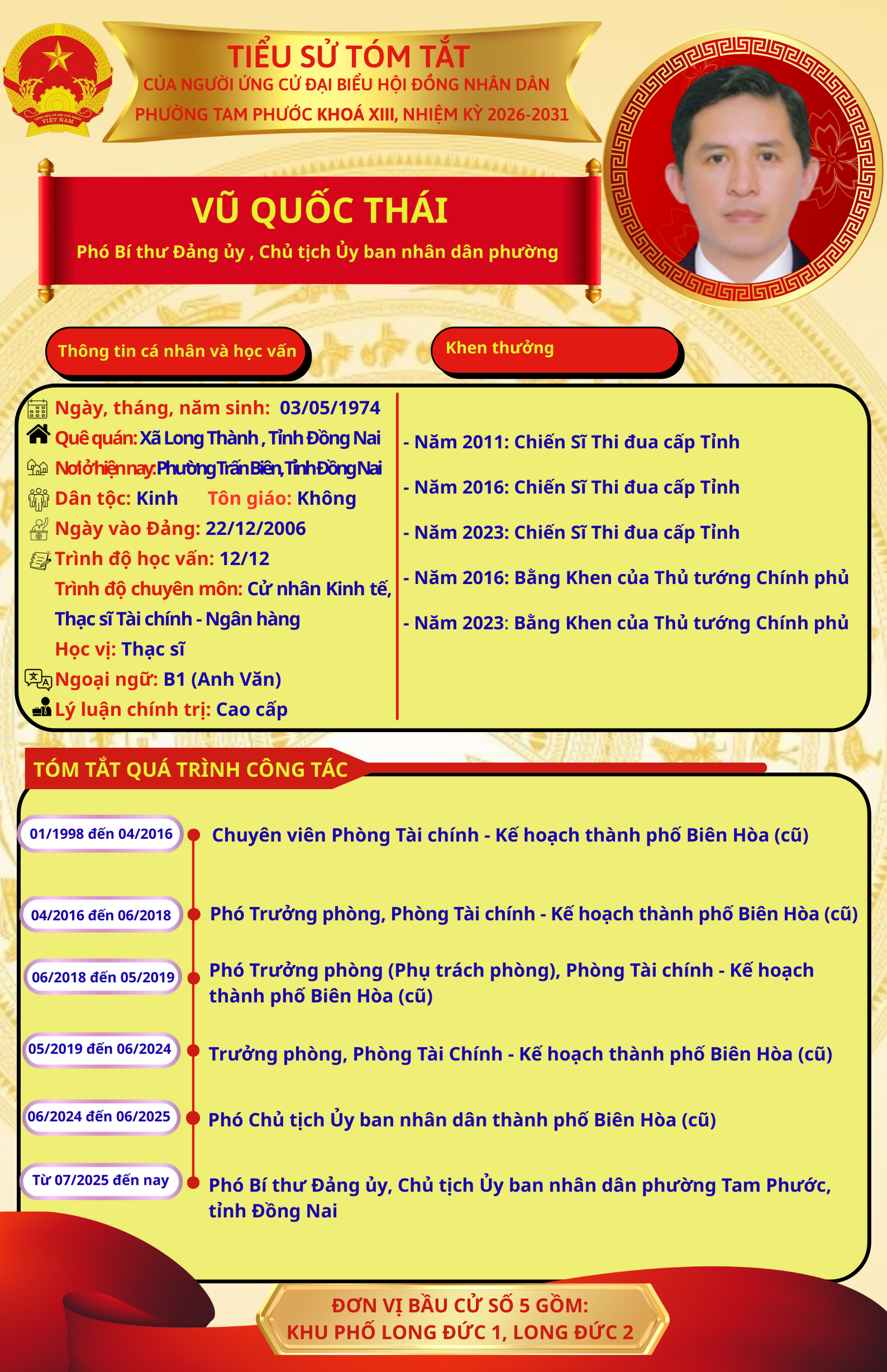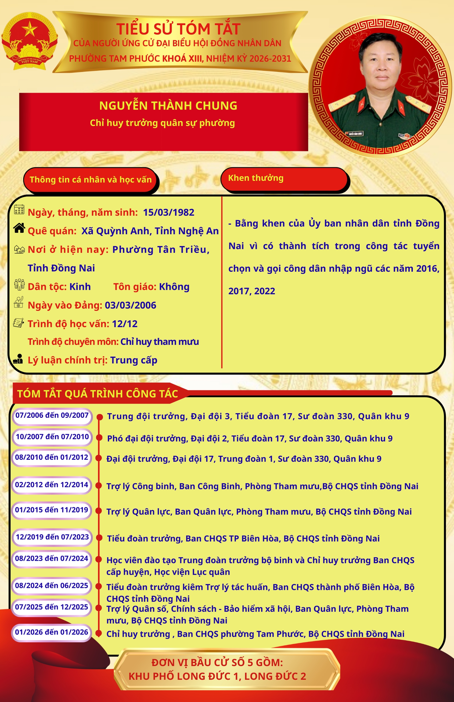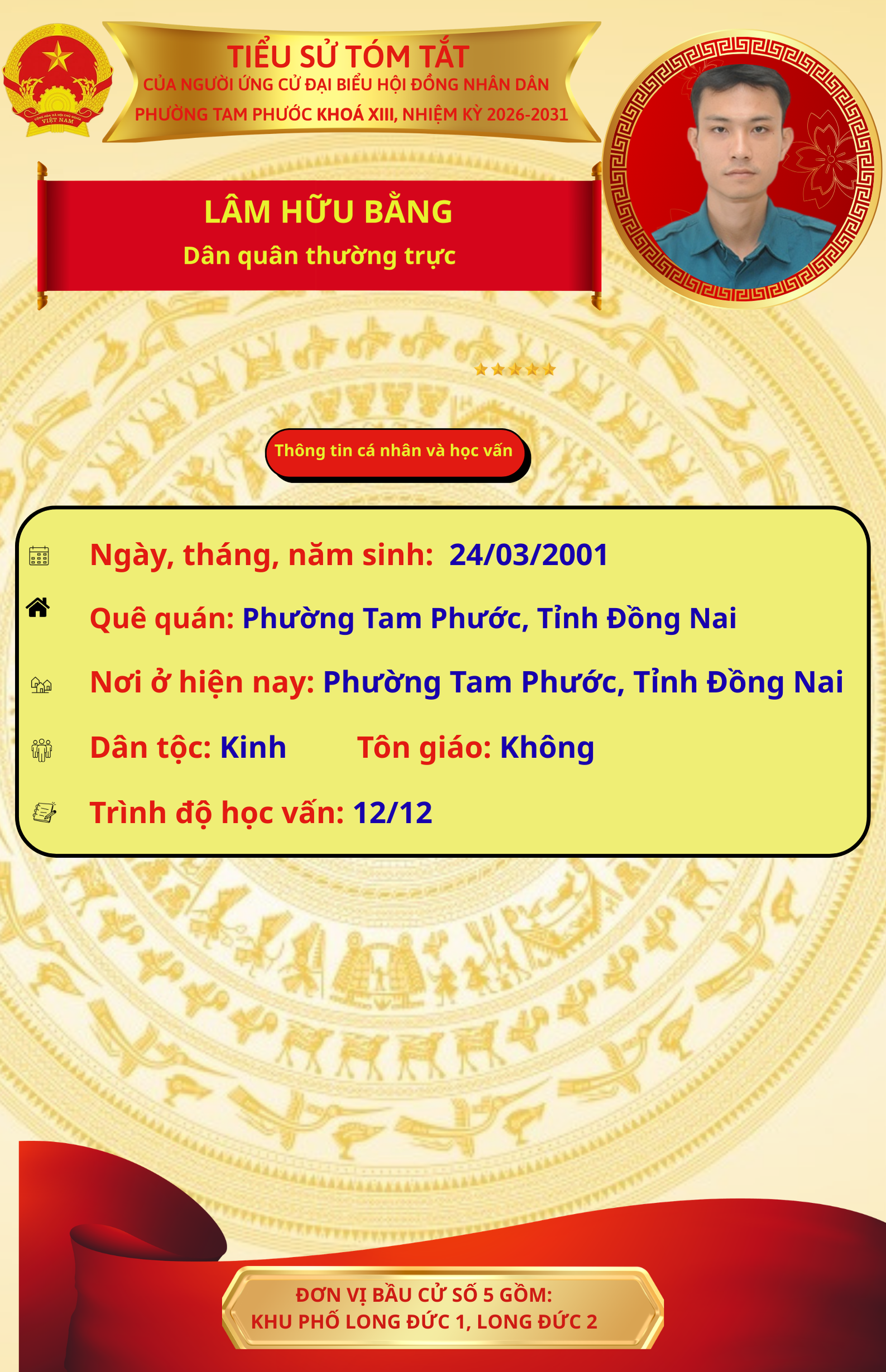 Để chuẩn bị cho ngày bầu cử 15/03/2026, Ủy ban Bầu cử phường Tam Phước trân trọng giới thiệu đến cử tri danh sách và tiểu sử tóm tắt của những người ứng cử đại biểu Hội đồng nhân dân phường Tam Phước (khóa XIII), nhiệm kỳ 2026-2031.