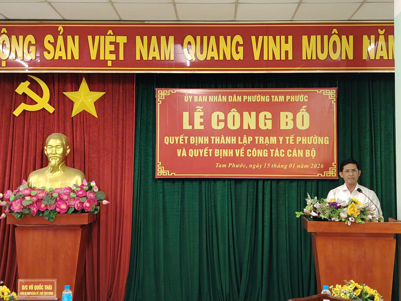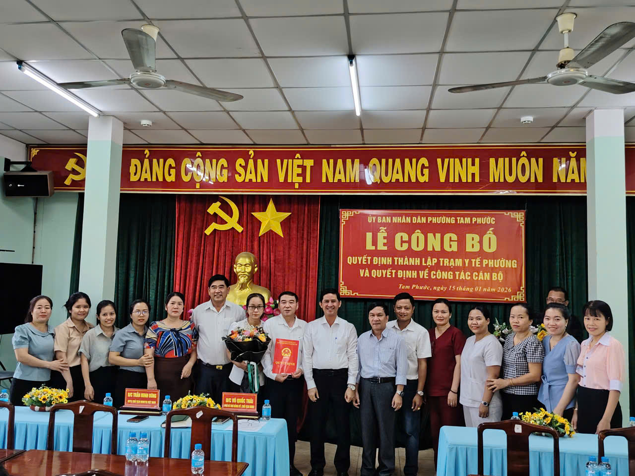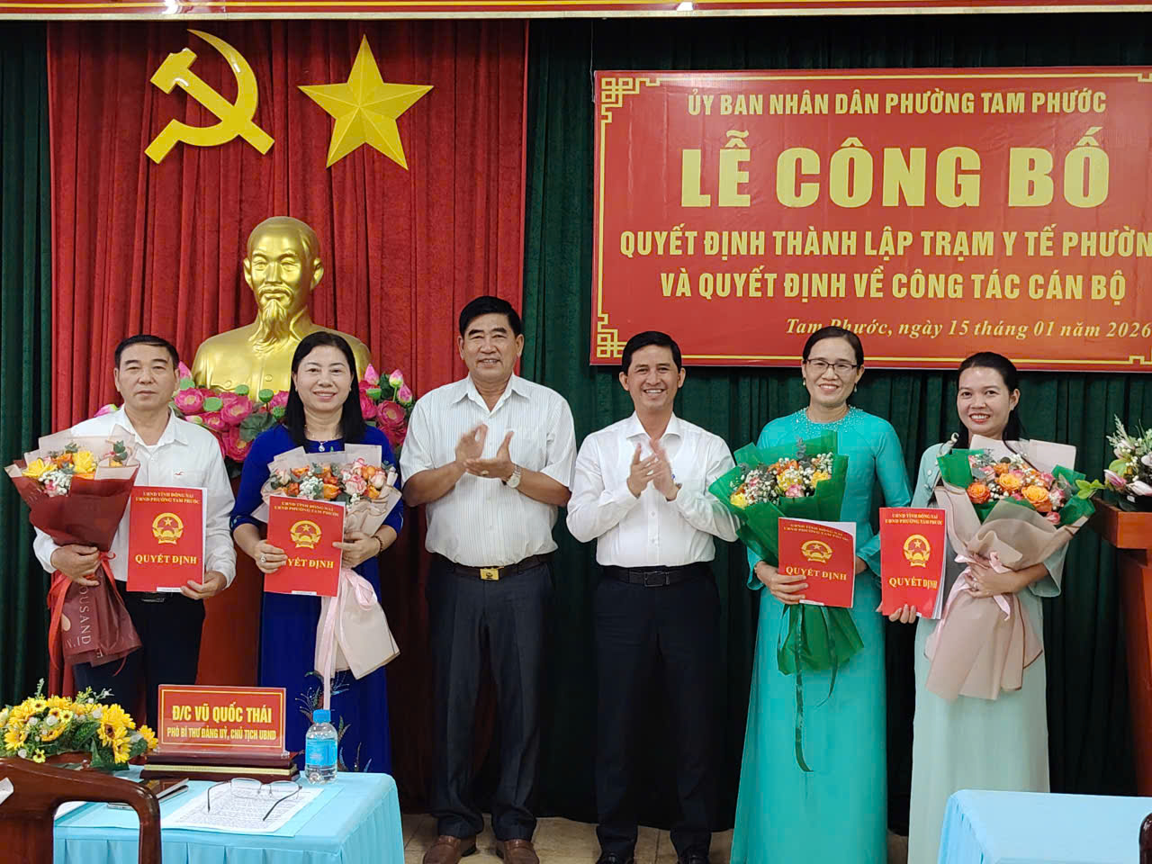 Chiều 15/01/2026, Ủy ban nhân dân phường Tam Phước long trọng tổ chức Lễ công bố Quyết định thành lập Trạm Y tế phường và các Quyết định về công tác cán bộ. Buổi lễ có ý nghĩa quan trọng, thể hiện quyết tâm của cấp ủy, chính quyền địa phương trong việc kiện toàn tổ chức bộ máy, nâng cao hiệu lực, hiệu quả quản lý nhà nước, đáp ứng yêu cầu chăm sóc sức khỏe nhân dân và phát triển giáo dục trên địa bàn trong giai đoạn mới.