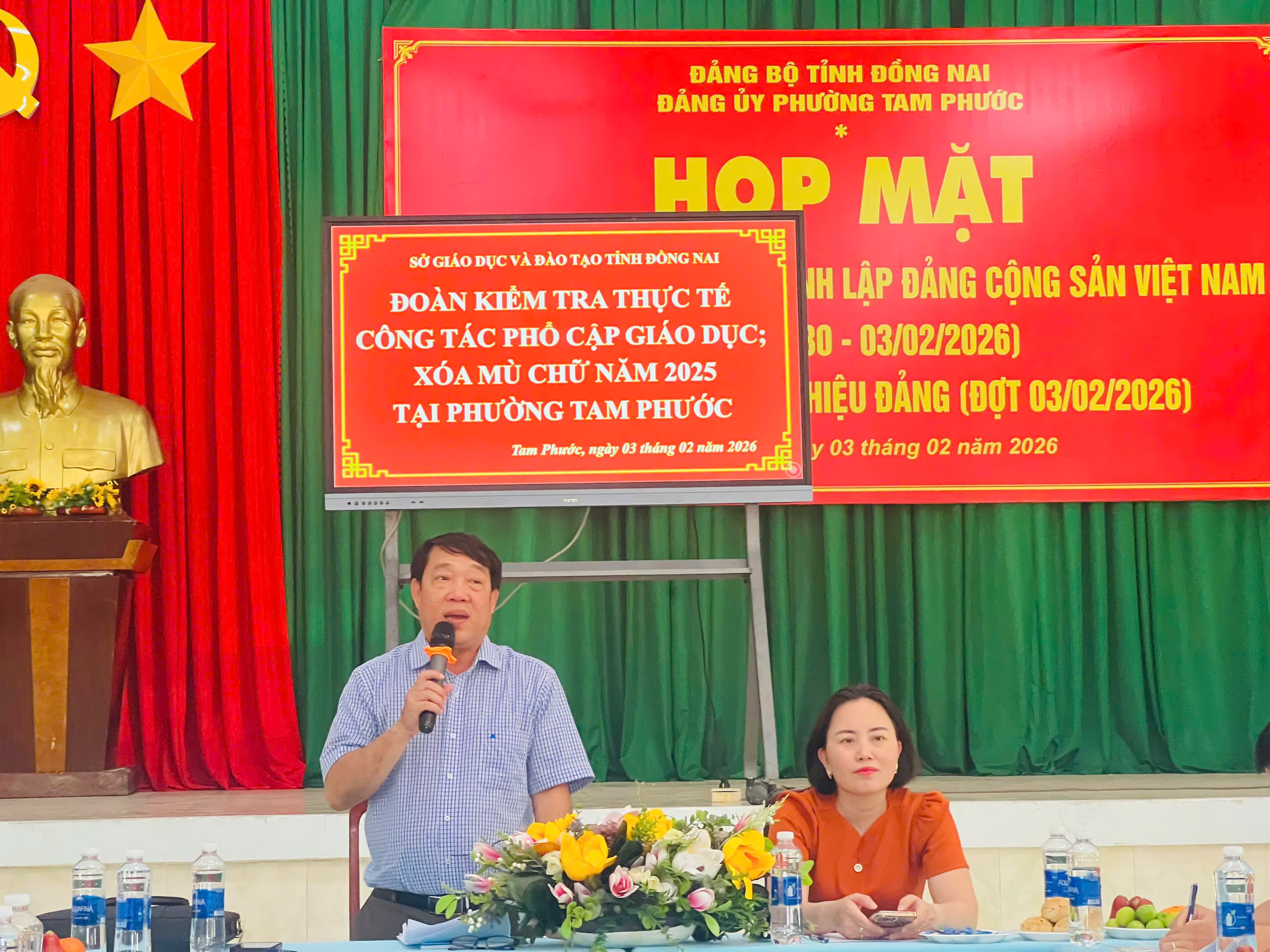 Chiều ngày 03/02/2026, tại trụ sở UBND phường Tam Phước, Đoàn kiểm tra thực tế công tác phổ cập giáo dục – xóa mù chữ (PCGD–XMC) năm 2025 của Sở Giáo dục và Đào tạo tỉnh Đồng Nai đã tiến hành kiểm tra, đánh giá toàn diện kết quả triển khai PCGD–XMC trên địa bàn phường.