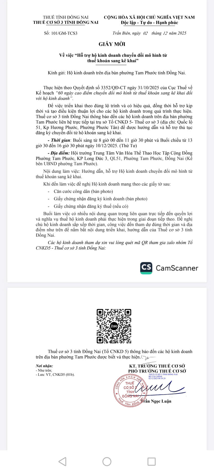 Thực hiện Quyết định số 3352/QĐ-CT ngày 31/10/2025 của Cục Thuế, về Kế hoạch “60 ngày cao điểm chuyển đổi mô hình từ thuế khoán sang kê khai đối với hộ kinh doanh”, Thuế Cơ sở 3 tỉnh Đồng Nai phối hợp với phường Tam Phước thông báo đến toàn thể bà con, đặc biệt là các hộ đang hoạt động kinh doanh, như sau: