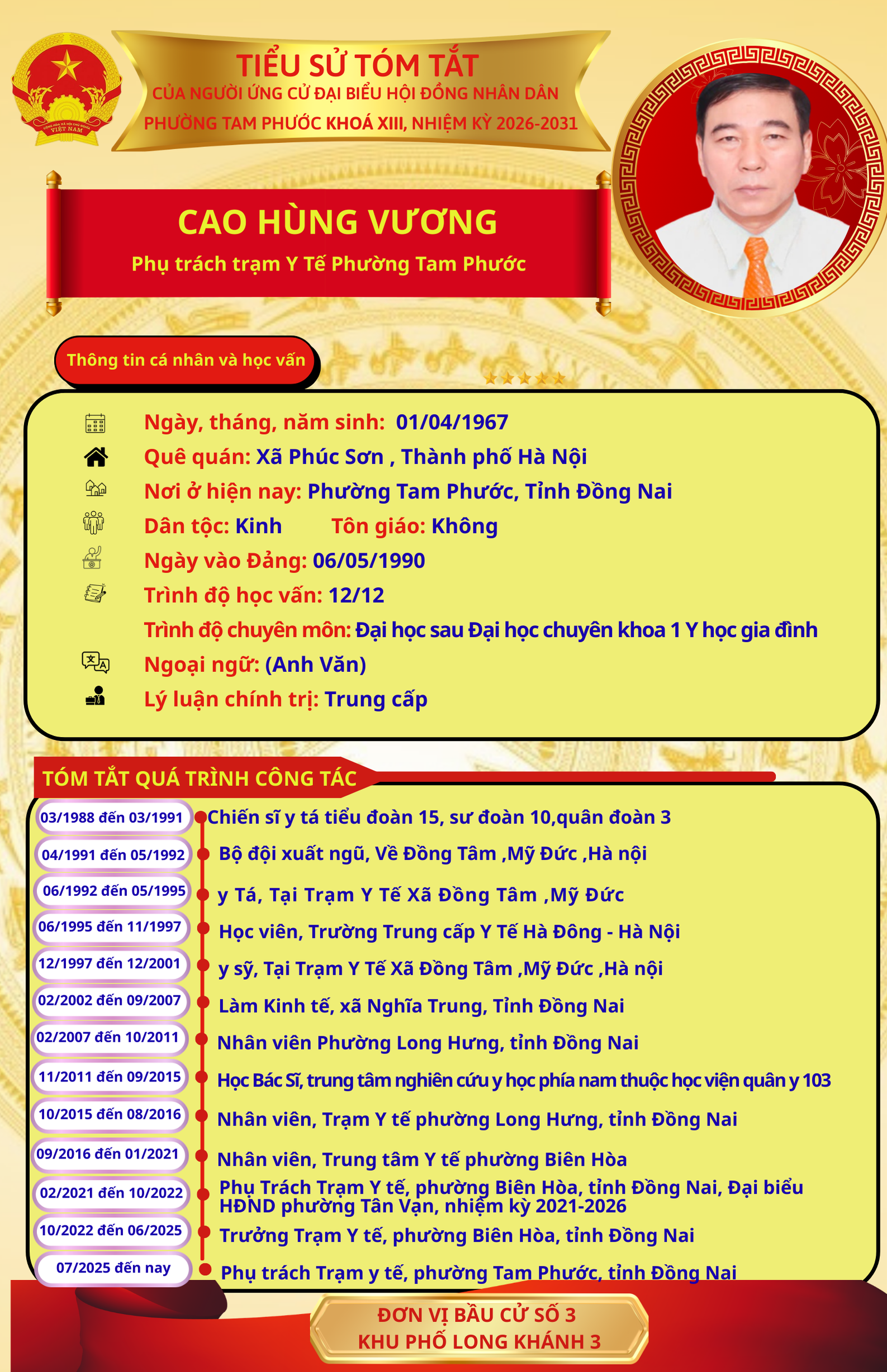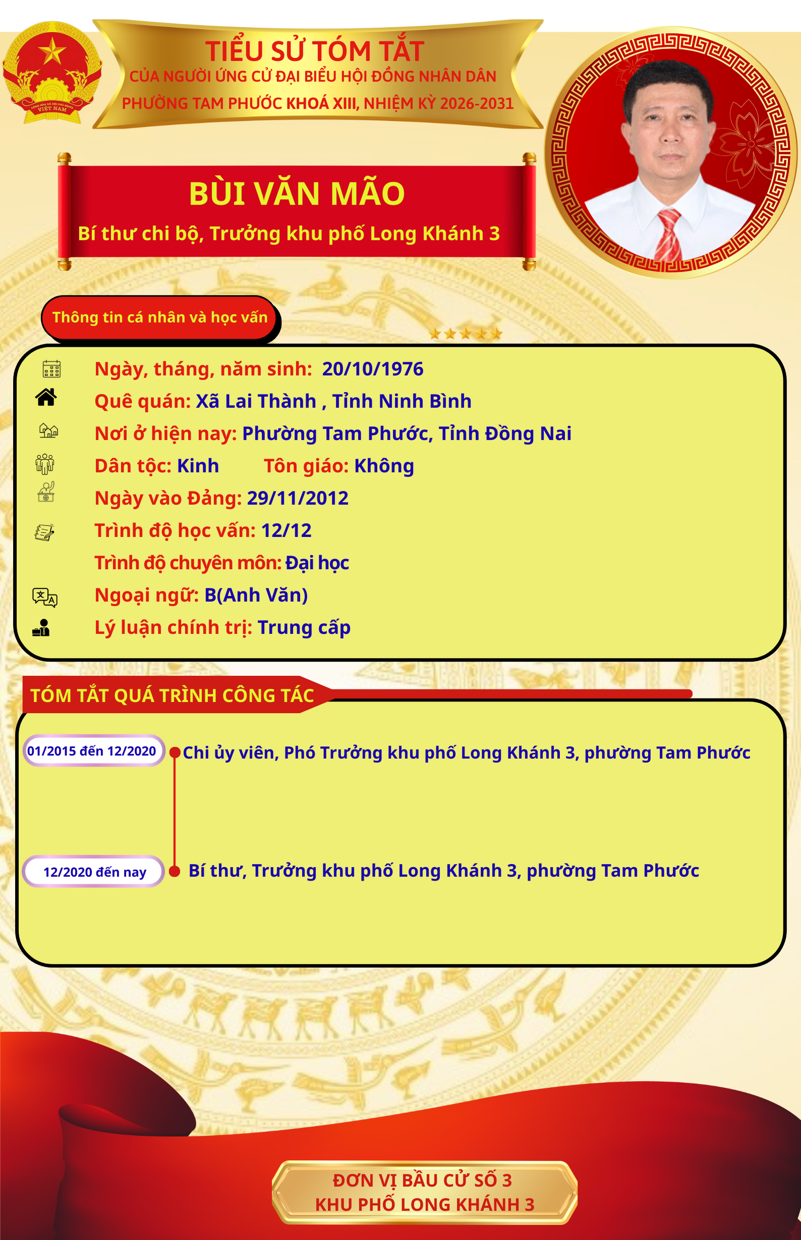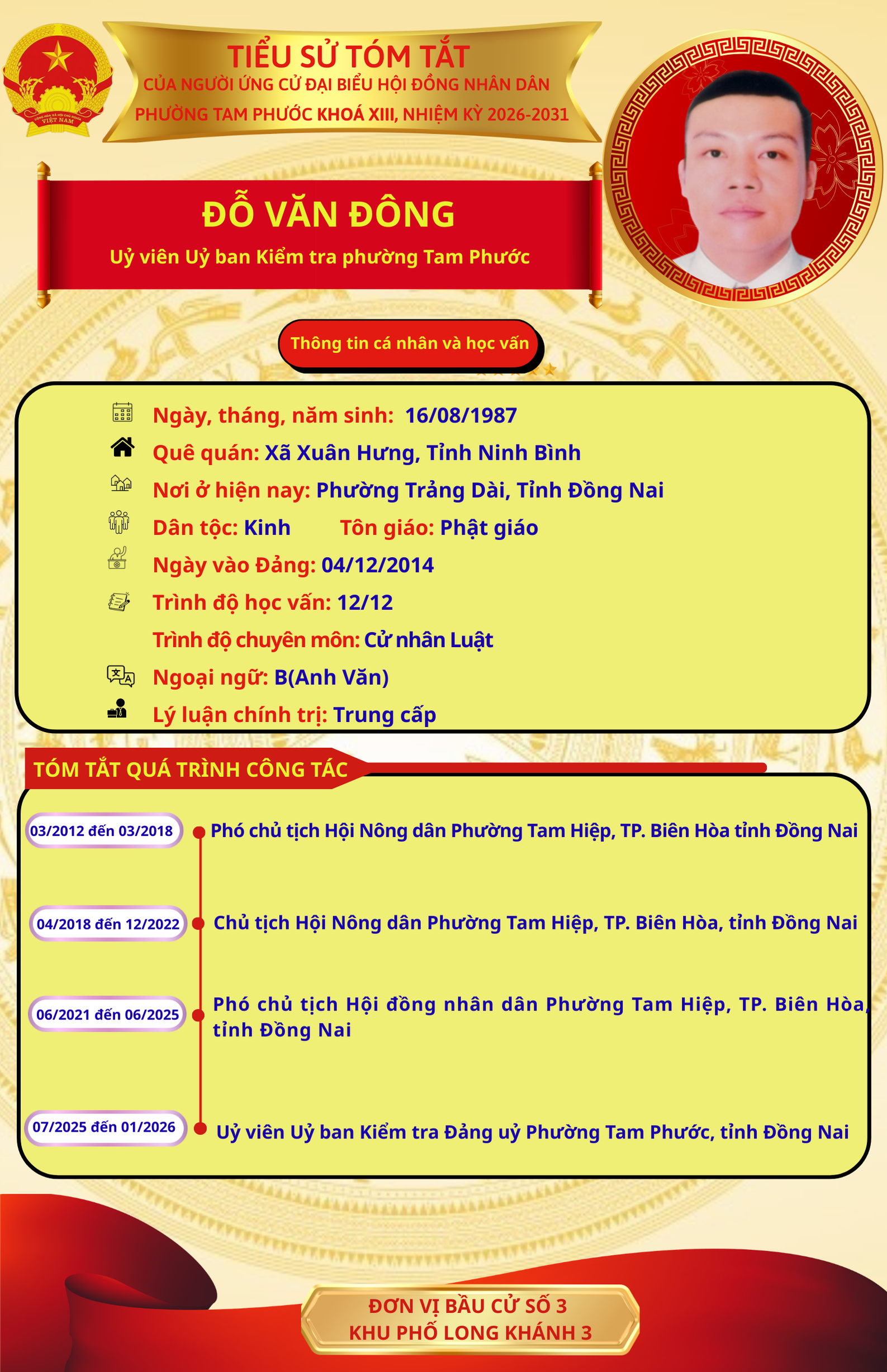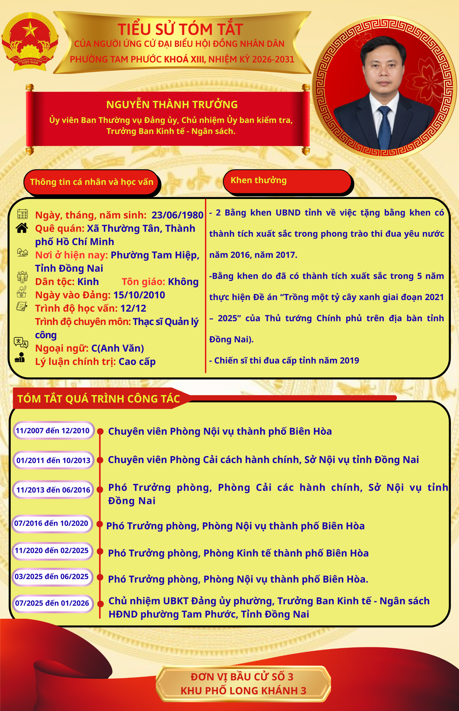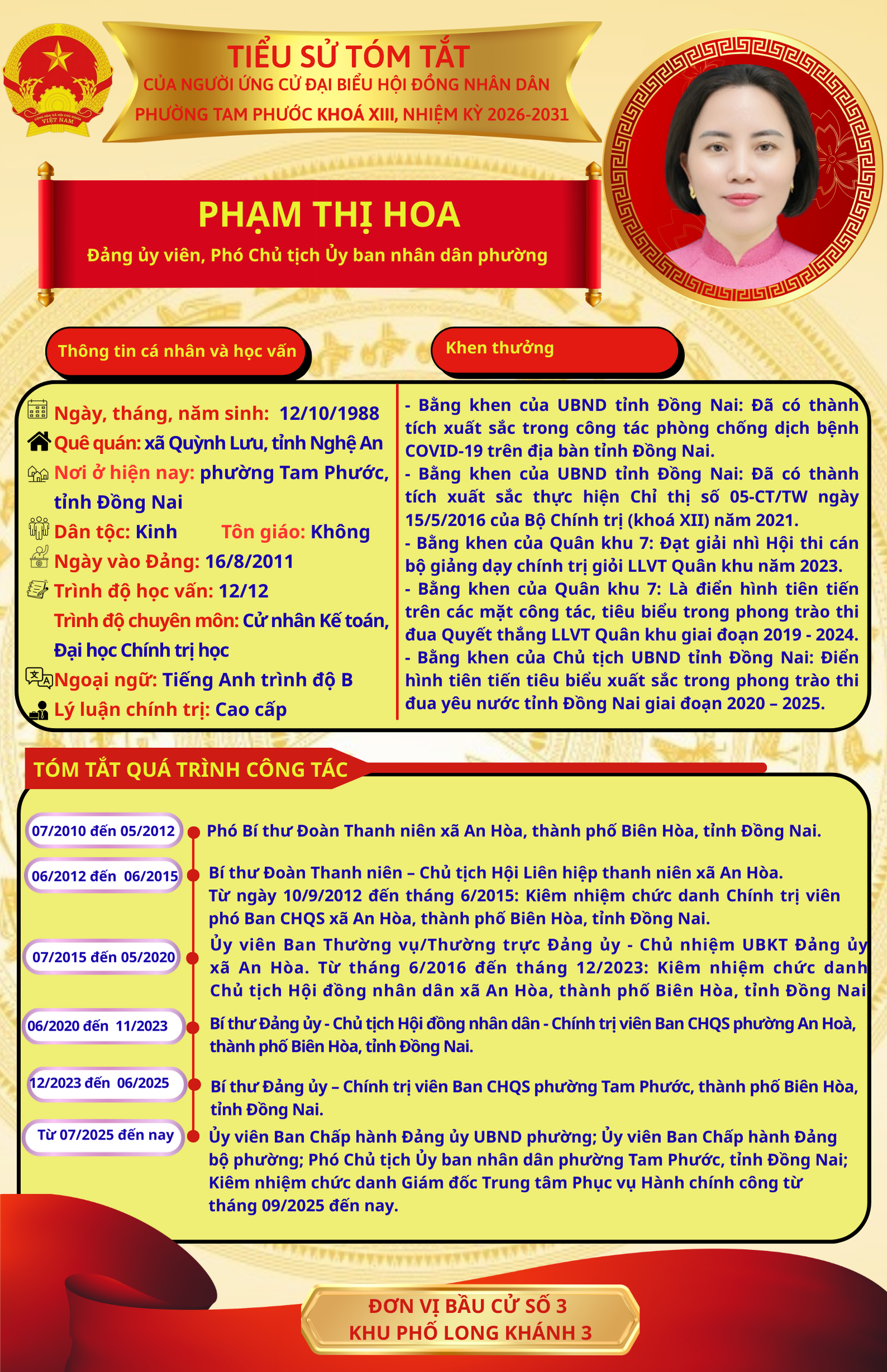 Để chuẩn bị cho ngày bầu cử 15/03/2026, Ủy ban Bầu cử phường Tam Phước trân trọng giới thiệu đến cử tri danh sách và tiểu sử tóm tắt của những người ứng cử đại biểu Hội đồng nhân dân phường Tam Phước (khóa XIII), nhiệm kỳ 2026-2031.
